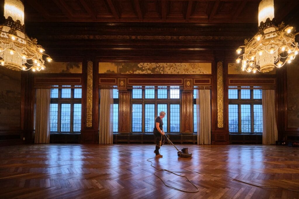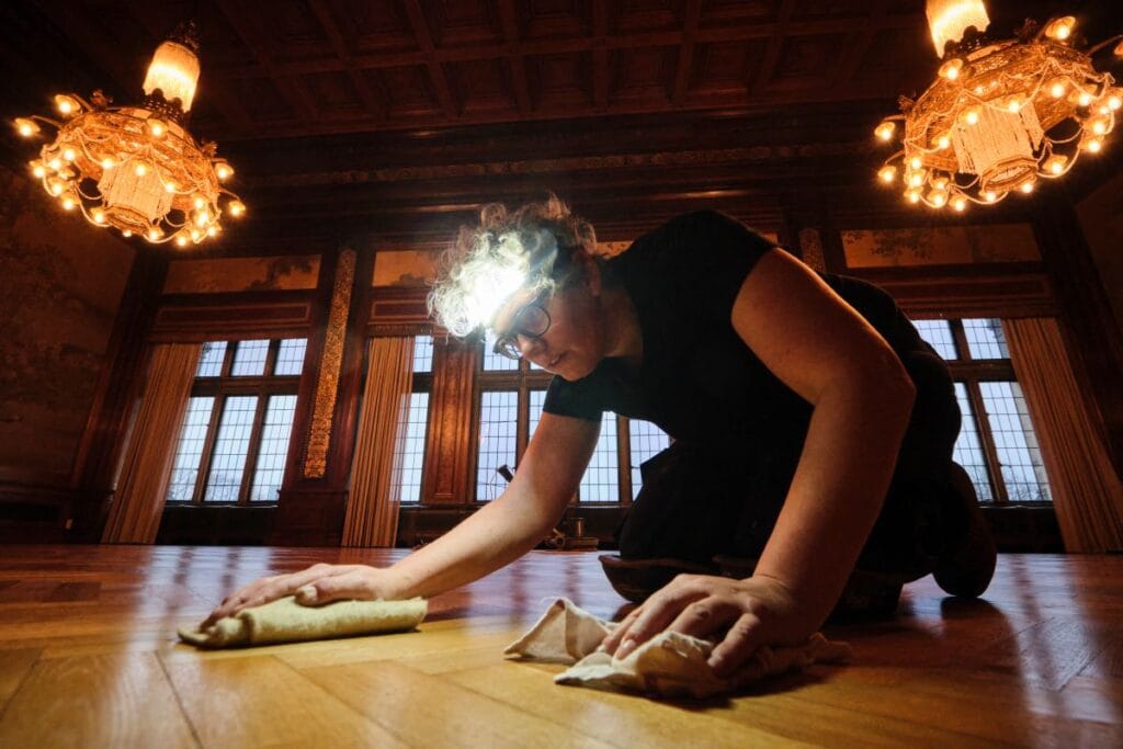 Bijenwas, ook wel boenwas geheten. Daarmee werkt Saar Berks de eikenhouten vloer in de Japanse Zaal van het Vredespaleis in De Haag af. Er was een ‘nieuwerwetse’ afwerking voorzien (lees: lak of olie), maar door de bouwhistorie te onderzoeken en te praten met de opdrachtgever mocht ze teruggrijpen naar de ouderwetse originele afwerking. “Dat dit mag, is uniek. Dit zijn ook wel de klussen waarvoor ik het doe.”