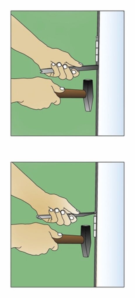 Een kwestie van de tool aan de onderkant op de scharnierpen zetten, er met een hamer tegenaan tikken en de pen schiet aan de bovenkant omhoog. Met de uitsparing aan de achterkant van de pennentikker wip je de pen er vervolgens helemaal uit.